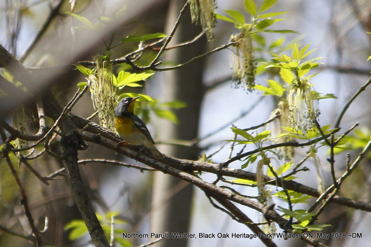 Looking at these photos are pretty amazing, and I'm glad I can share them with the world on this blog (and through ebird). I can't help but notice that at this time of year, its really cool to see how trees have this explosion of foliage in the form of new leaves -yes- and also the delicate beauty of the catkins that various trees produce. Taking a closer look at these photos also gave me a chance to look at the leaf shape to identify the tree species... It seems to be a Bur Oak - A White Oak species that is famous for making casks for Whiskey and Bourbon (feel free to correct me if I'm wrong on that ID). Ask any Whiskey fan and they will tell you that the best flavours come from a barrel that is lightly charred and made from Virgin White Oak. (I'm a big fan of the award winning "Lot 40" whiskey made by the JP Wiser's folks in Walkerville's Hiram Walker distillery ... but that is a topic for another day. Lot 40 is matured in Virgin White Oak Casks).